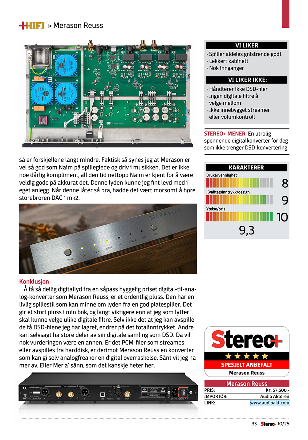 Digital-to-analog conversion: The task of digital-to-analog conversion is performed by two 1794A converter modules from Burr Brown. For a 5 dB improvement in dynamic range, each channel has its own device. The analog current signal is elaborately converted into a voltage signal in a discrete setup, which is buffered in Class A technology and routed to the output. The Reuss is fully balanced, i.e. a total of four independent channels are implemented from the two converter modules to the output.